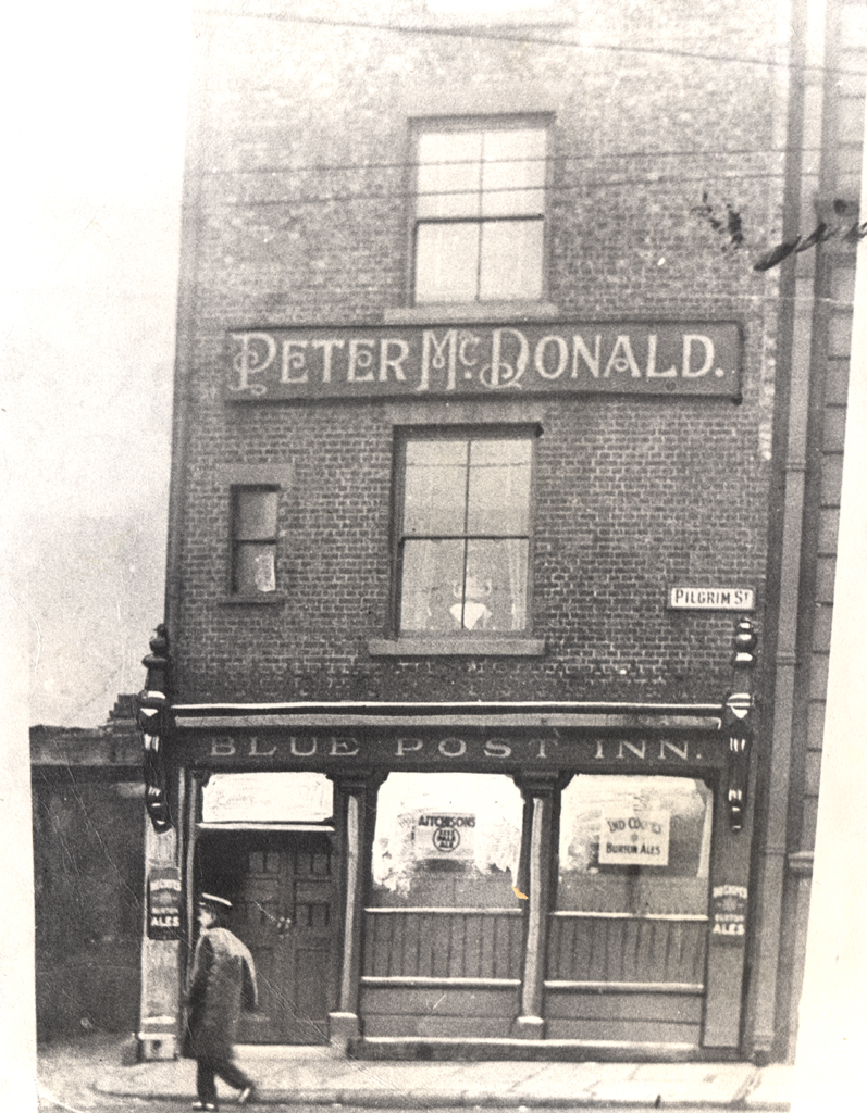 Shown on Ordnance Survey second edition. Martha Morton brewed here from 1855 to 1858. John Hunt worked here until 1861. James Hall was brewer from 1861 to 1864/5. W.B. Reid bought the Blue Posts. It closed in 1931.