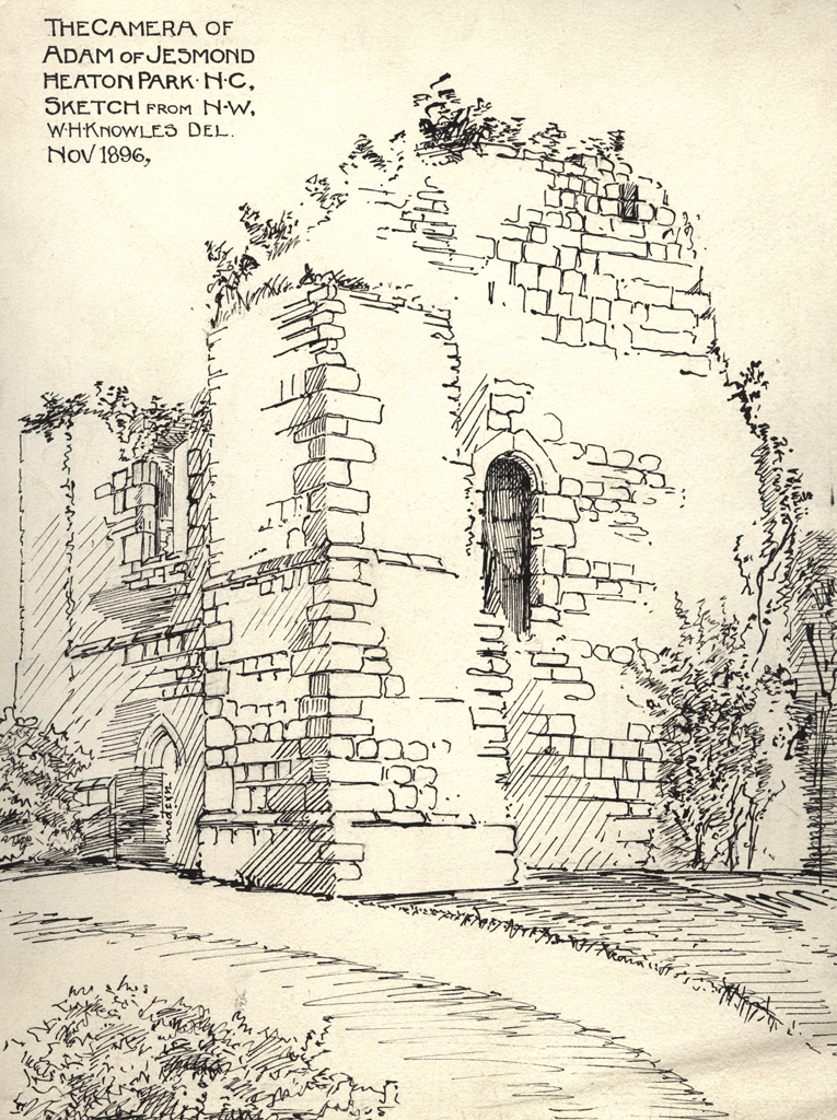 Attributed to Adam of Jesmond (sometimes misleadingly called King John's Palace) because he held the manor of Heaton in the mid-13th century and the structure appears to date from this time. It has been suggested that the building had gone out of use by the early 17th century, and it was said to be in ruins in 1776. Abutting structures were demolished in the mid-nineteenth century. Whether it was a house or tower is uncertain. Its present remains consist of a north wall and the north end of an east wall, both standing two storeys high. Its original length is unknown. The principal room was a hall on the first floor, originally with a 2-light north window, and with at least one lancet in the east wall. A drawing of the west wall (before it fell down) shows a first floor door. Several restorations have made further interpretation of the building rather difficult. SCHEDULED ANCIENT MONUMENT AND LISTED GRADE 2