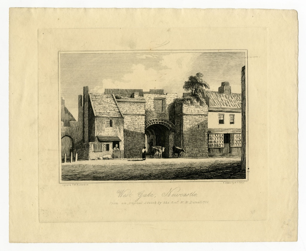 After New Gate, the West Gate was the largest gateway into the town, providing access on the main route from the west. Two published views, both from the outside, hint at a great tower behind a barbican which terminated in square turrets. The vaulted passage appears to be open in the centre, perhaps the site of the turning bridge referred to in 1574, and the whole is quite similar to Tynemouth gatehouse. It was presumably built in the 13th century, with the barbican probably a later addition, perhaps by Roger Thornton? Used as a prison in the 16th and 17th centuries, and as a magazine. In the 18th century it was a meeting hall for the House Carpenters Company. Temporarily blocked up in 1745; a footway was opened on the north side of the gateway in 1782; the whole gate was demolished in 1811/12.
