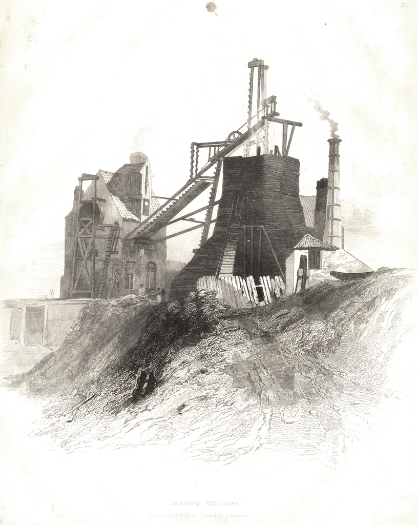 Jarrow Colliery, was connected to Jarrow Staith (SMR 2260) by a wagonway (SMR 2259). The first edition OS mapping shows the extents of the spoil heaps. Jarrow Colliery was opened in 1803 by Simon Temple who leased the coal royalties from the Dean and Chapter of Durham Cathedral. Subsequent owners included Thomas and Robert Brown, D. Brown, W. Blackett and N. Wood, Anderson and Philipson (1850s). Several explosions - 25 September 1817, 6 were killed; 17 January 1826, 42 were killed; 15 March 1828, 8 were killed; 3 August 1830, 42 were killed; 21 August 1845, 39 were killed. It closed in 1851 after another explosion but was subsequently purchased by the Hetton Coal Company and worked from their other pits. Picture by TH Hair 1844.