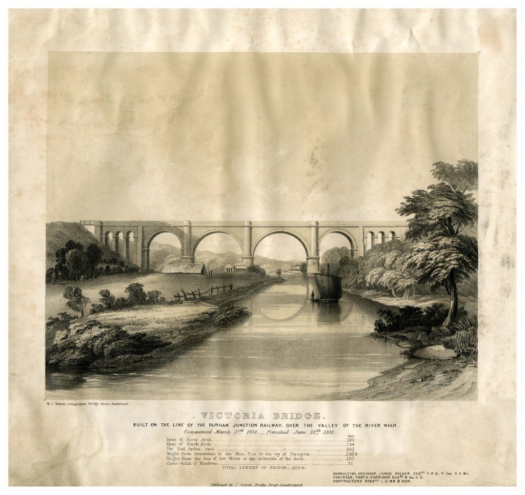 'Railway bridge. 1838 by James Walker of Walker and Burges. Rusticated sandstone. 4 main arches, the most southerly spanning the Wear, and 3 minor at each end : main spans 100', 160', 144' and 100'; height from foundations to top of parapet, 156'6". Arches have voussoirs and bands; impost blocks to the minor arches. 3 semi-circular buttresses continue as refuges in the parapet. Massive coping to plinths of cutwaters. Historical note : Built for the Durham Junction Railway and completed on Victoria's coronation day, 28th June, it carried the main London-Newcastle line until 1868. Links the valley sides at their crest, and was modelled on Trajan's bridge at Alcantara although not a copy. Source: Tomlinson North Eastern Railway (Newcastle 1914) 227, 318, 319.'