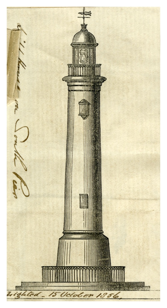 In 1856 a fine wrought iron lighthouse was built on the old South Pier. At the top of the tower was a cast iron dome and internal access to the light was by a cast iron staircase. The 50 feet high structure was designed by Thomas Meik who also designed the Hendon Dock and one of the nearby dock-side warehouses, which survived until the early 1990s. The lighthouse can be seen today on the Roker sea front, not in its original position, having been dismantled and re-erected in 1983 when the Sunderland Port Authority shortened the pier to create an easier and safer entrance into the river. The white painted lighthouse consists of a base of cast iron, atop which is a tapering conical shaft of rivetted steel, above which is a cast iron dome containing the light, and a gallery. Internally there is a cast iron spiral staircase around a central column. Above the doorway to the lighthouse is a small circular plaque showing a sextant and the date 1856. The lighthouse is set on a circular base of two stone steps, and is surrounded by railings. LISTED GRADE 2*