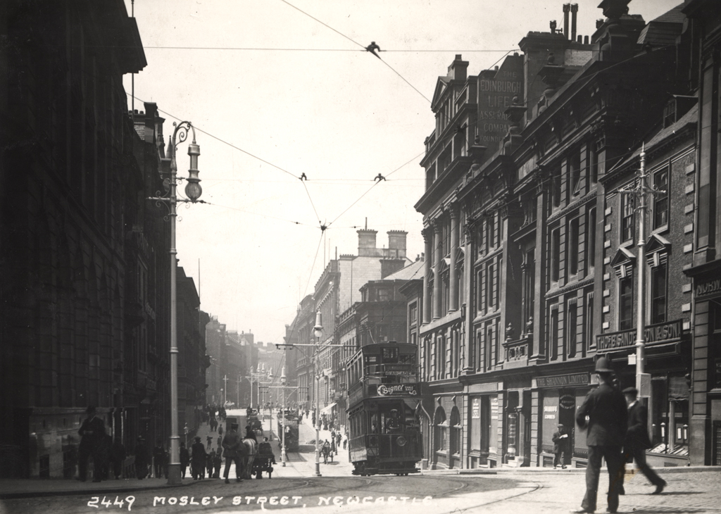 Mosley Street was built in 1784-5. It was designed by David Stephenson. One of the premier shopping and commercial streets of the Georgian town. In 1788 the Theatre Royal was built in Mosley Street. At the end of the nineteenth century national banks and insurance companies built premises here.