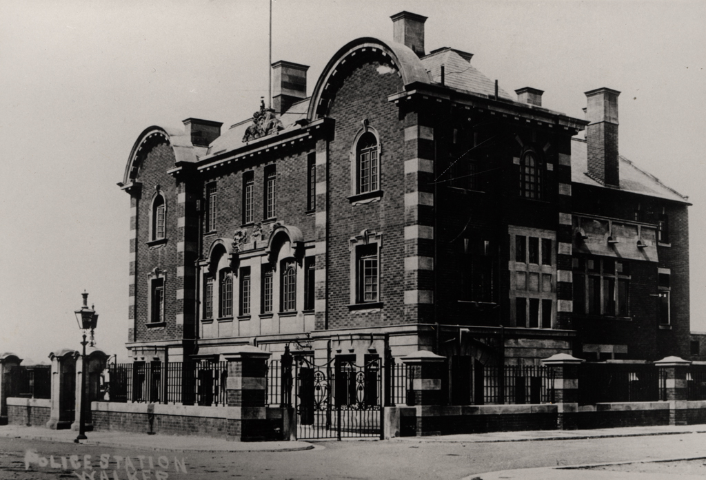 The police station was built in 1908. On either side of the spacious entrance hall there was a waiting room and superintendent's office. Adjoining this was the charge room and four cells. At the end of the cell corridor there was an airing courtyard for the prisoners. Immediately opposite the entrance was the parade room and police surgeon's room. On the first floor there were messrooms, recreation room and dormitories divided into twelve cubicles. The building was built of red pressed brick with stone dressings, and roofed with Newfoundland green slate. The interior walls were decorated with a salt glazed brick, floors of Portland cement concrete. The entrance hall was tiled. There were stone carvings by Christian Neuper, Newcastle sculptor, on the front elevation of the building - a male figure representing justic and strength, a female figure representing truth and light, and a head symbolic of deceit and falsehood. The building cost £9000.