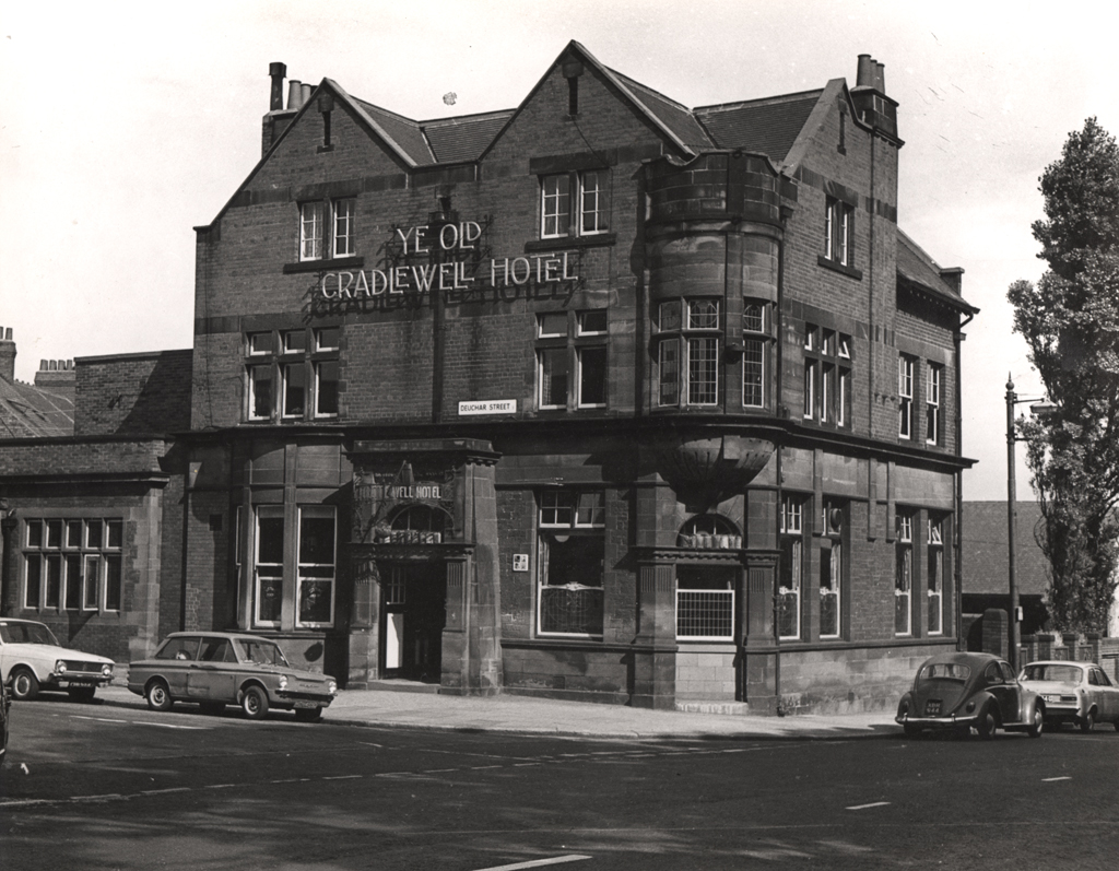The Cradlewell pub was opened in 1904 by Robert Deuchar. It was built on the site of the original Cradlewell Public House which dated from c.1833. The pub took its name from the nearby water trough. Deuchar’s building is sandstone and brick. The main section is three storeys and there is a one storey extension which is now used as an entrance. A further entrance on the south face is surrounded with elaborate carving in the sandstone which contrasts with the muted decoration elsewhere. Another elaborate feature is the oriel window at the first floor on the south east corner. It has a sandstone bowl base and a parapet that rises to the top of the second floor and the windows are of stained glass. LOCAL LIST